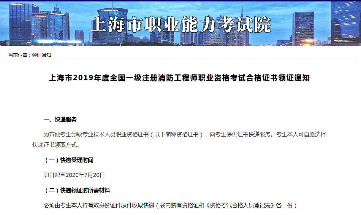 上海市职业能力考试院发布2019年度全国一级注册消防工程师职业资格考试合格证书领证通知。