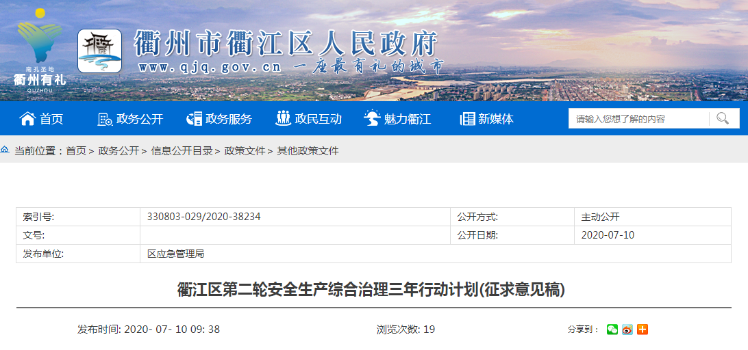 近日,浙江省衢江市衢江区发布《衢江区第二轮安全生产综合治理三年行动计划(征求意见稿) 》