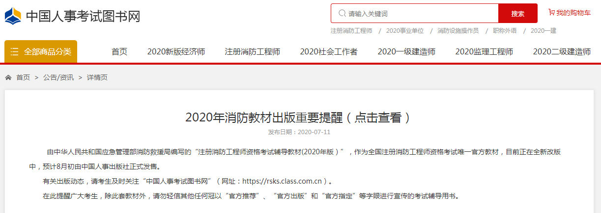 终于,中国人事考试图书网公布:2020年消防教材出版重要提醒!“注册消防工程师资格考试辅导教材(2020年版)”,目前正在全新改版中,预计8月初由中国人事出版社正式发售。