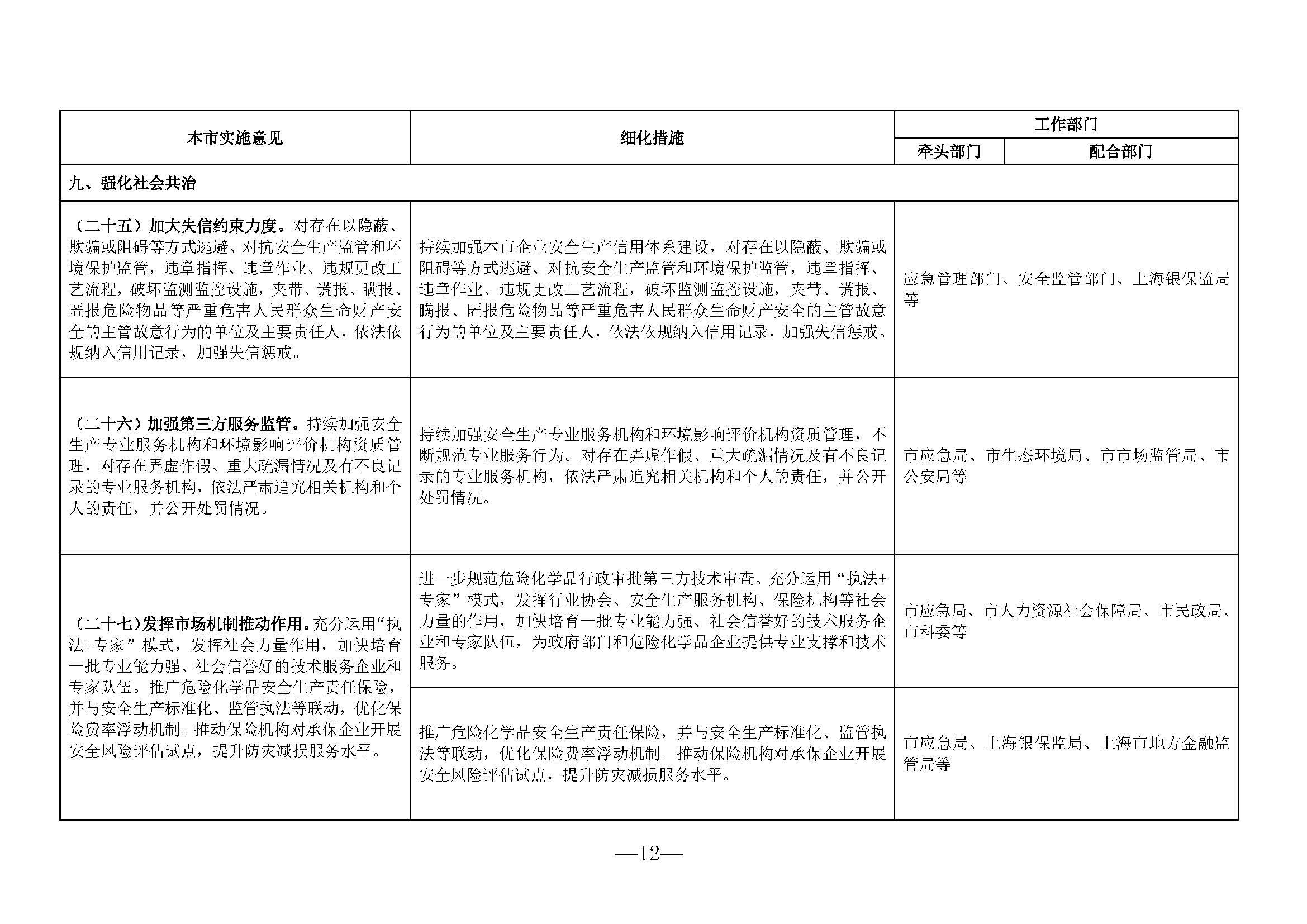 《分工表》一共28条实施意见,70条细化措施,涉及市应急局、市科委、市市场监管局、上海化学工业区管理委员会、市消防救援总队、市卫生健康委、市交通委、市应急局、市市场监管局等各部门各行业和系统负有安全管理职责的部门。