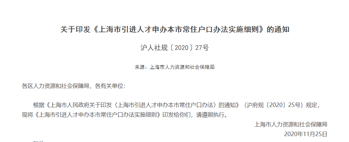 根据《上海市人民政府关于印发〈上海市引进人才申办本市常住户口办法〉的通知》(沪府规〔2020〕25号)规定,现将《上海市引进人才申办本市常住户口办法实施细则》印发给你们,请遵照执行。