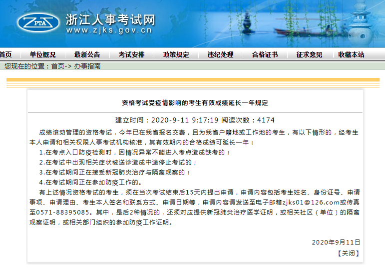 浙江人事考试网“办事指南”栏目发布的《资格考试受疫情影响的考生有效成绩延长一年规定》获悉:成绩滚动管理的资格考试,今年已在我省报名交费,且为我省户籍地或工作地的考生,有以下情形的,经考生本人申请和相关权限人事考试机构核准,其有效期内的合格成绩可延长一年: