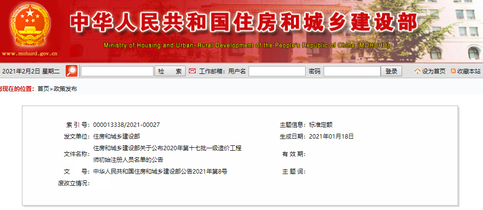 住房和城乡建设部关于公布2020年第十七批一级造价工程师初始注册人员名单的公告