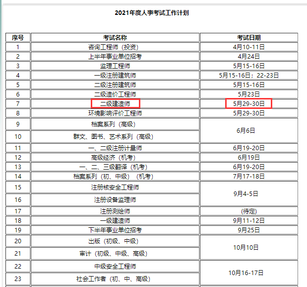 通知公布:浙江省2021年二级建造师考试日期为5月29日-30日
