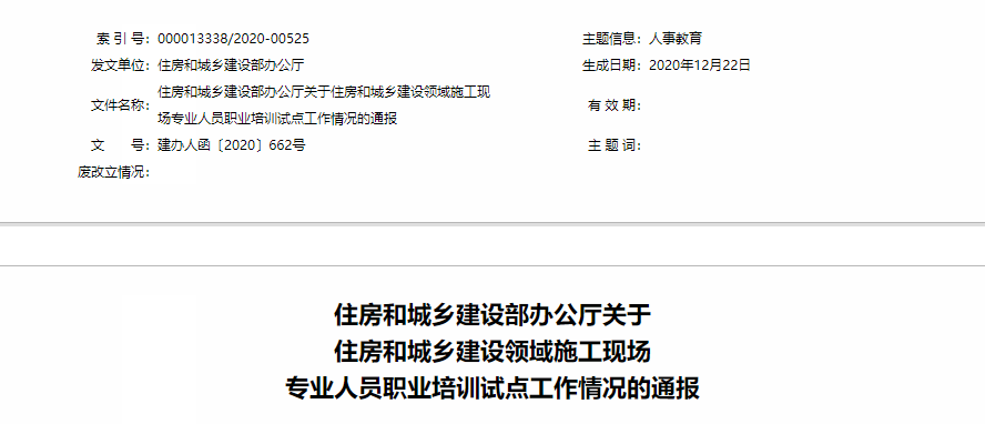 近日,住建部发布《关于住房和城乡建设领域施工现场专业人员职业培训试点工作情况的通报》。《通报》明确:组织编制了全国统一培训测试题库,并依据试运行情况,对系统和题库进行了完善,供各地免费使用。