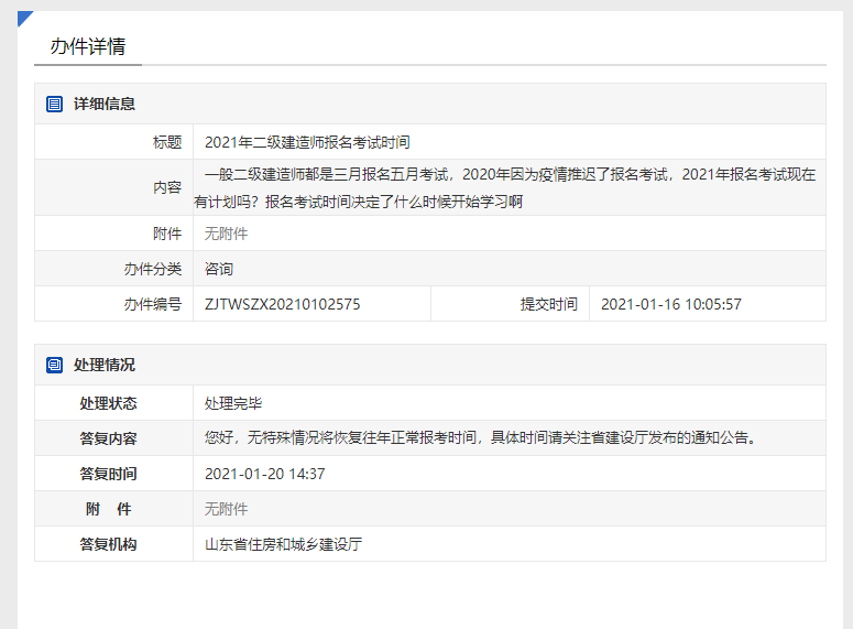 近日,山东住建厅回复关于“2021年二级建造师报名考试时间”的问题中,明确指出“无特殊情况将恢复往年正常报考时间,具体时间请关注省建设厅发布的通知公告。