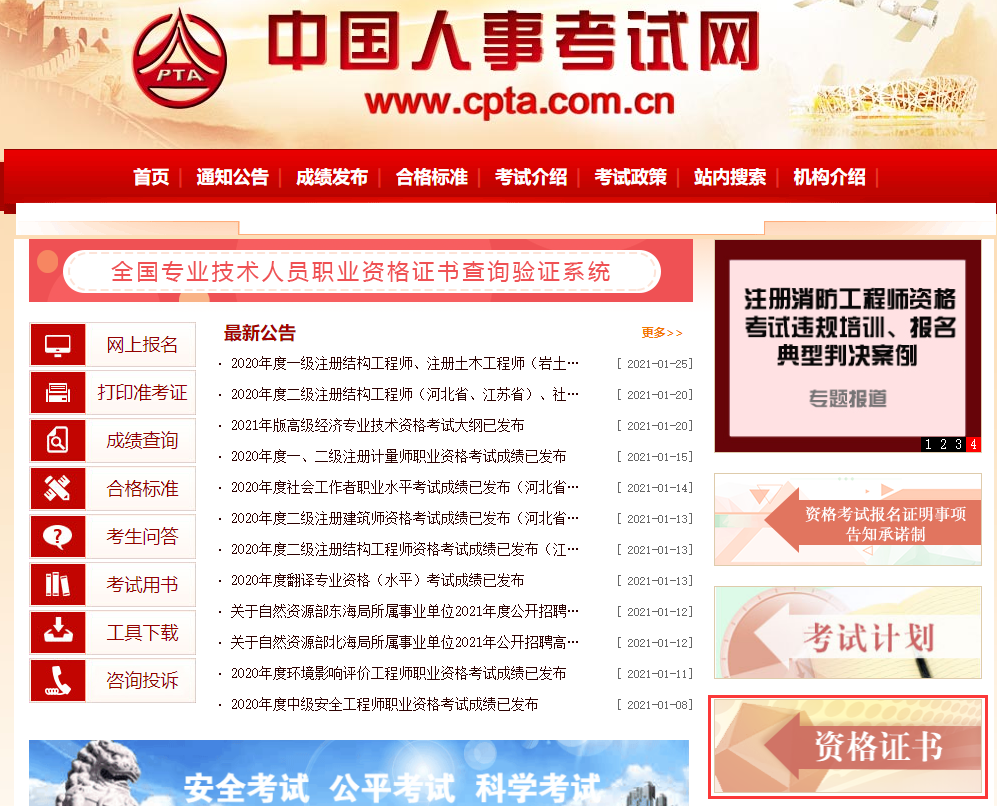 登录中国人事考试网(www.cpta.com.cn),点击【资格证书】。