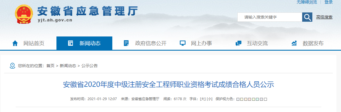 根据《司法部关于印发开展证明事项告知承诺制试点工作方案的通知》(司发通〔2019〕54号)、《人力资源社会保障部办公厅关于印发<人力资源社会保障系统开展证明事项告知承诺制试点工作实施方案>的通知》(人社厅发〔2019〕71号)及《人力资源社会保障部人事考试中心关于印发<专业技术人员资格考试报名证明事项告知承诺制试点工作实施方案>的通知》(人考中心函〔2019〕26号)的规定和要求,现将安徽省2020年度中级注册安全工程师职业资格考试成绩合格人员予以公示,共1409人(名单附后)。